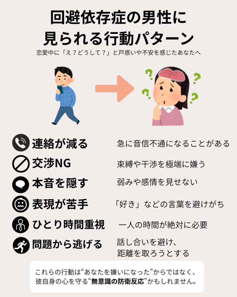 回避依存症の男性には、恋愛において以下のような特徴や行動の傾向が見られます。